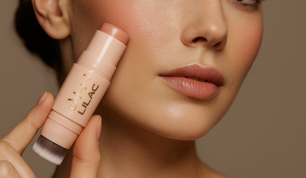 • ضعي بلاشر ستيك على الوجنتين أو أي منطقة تحتاج إلى لمسة من اللون.